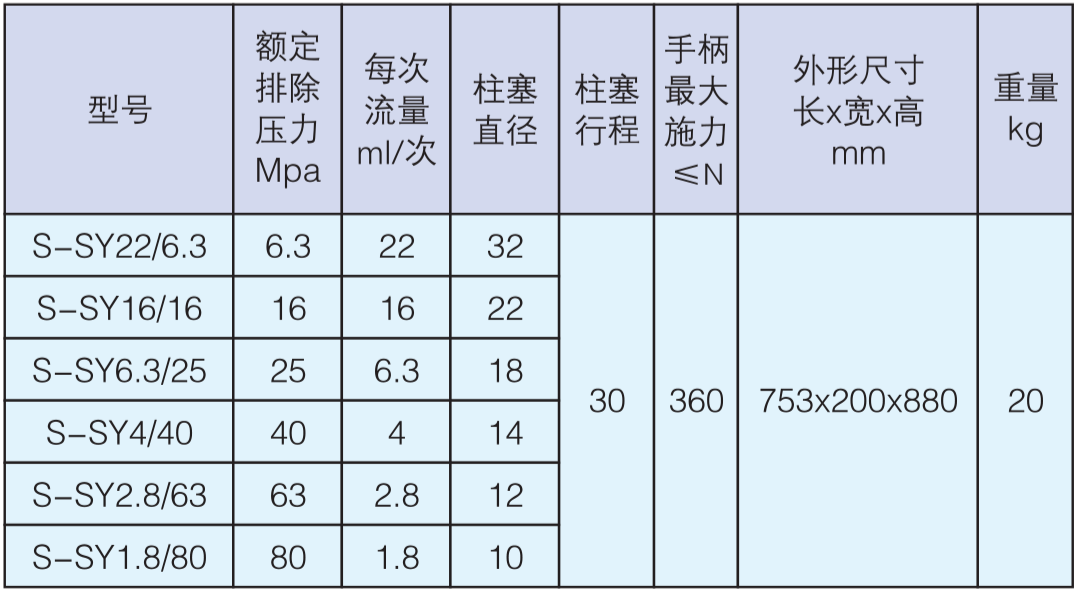 S-SY型系列手动单缸试压泵(以下简称为泵),专供各类压力容器、管道、阀门、蒸汽锅炉等作试验和试验室中获得液体高压源的设备。工作介质为5℃-60℃的清水,乳化液以及运动粘度不大于45mm2/S的油品,本系列泵有8种型号。