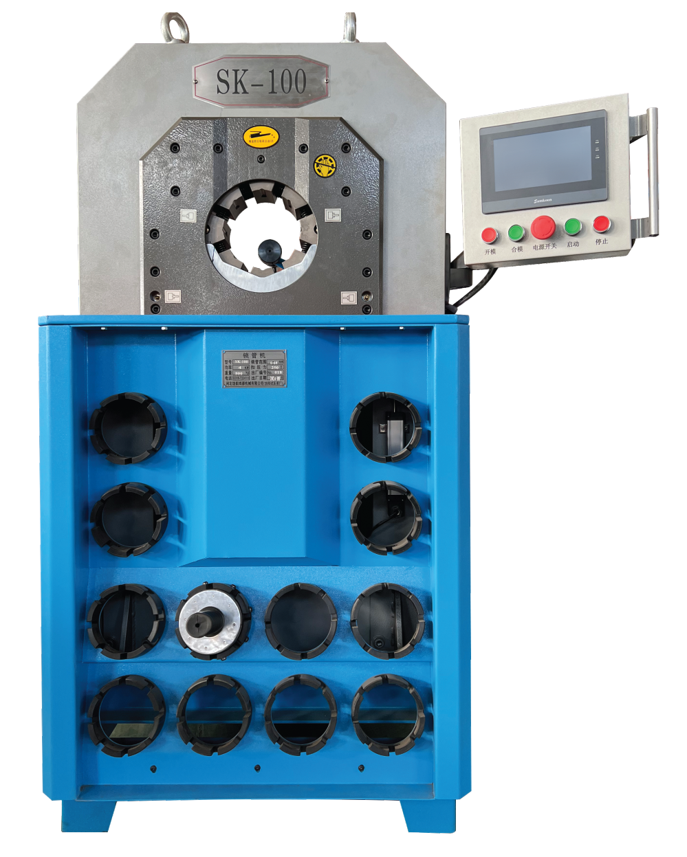 我厂研制生产的SK-100型锁管机适用于工农业和工程机械液压传动用高压胶管、纤维管、塑料管总成的扣压加工。具有扣压范围广、精度高(采用PLC控制)、自动化程度高、易操作、好维修等优点。