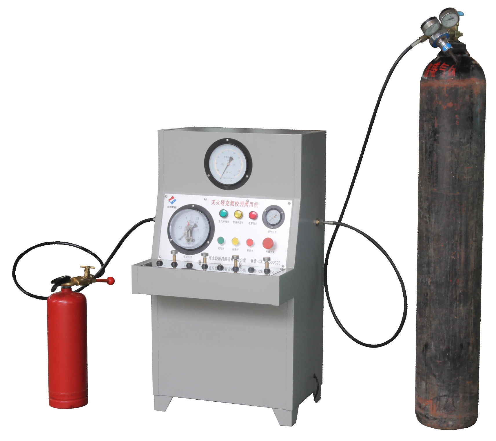 2、首先接通机箱边气源接头与原装氮气钢瓶的输气管路,确保不漏气。当用做氮气充装时,把原装氮气钢瓶减压阀的出口压力表调至高于被充灭火器需用压力的0.2-0.5Mpa。例如:灭火器需充装的压力为1.2Mpa,原装氮气钢瓶的出口压力表则需调整为1.4-1.7Mpa。